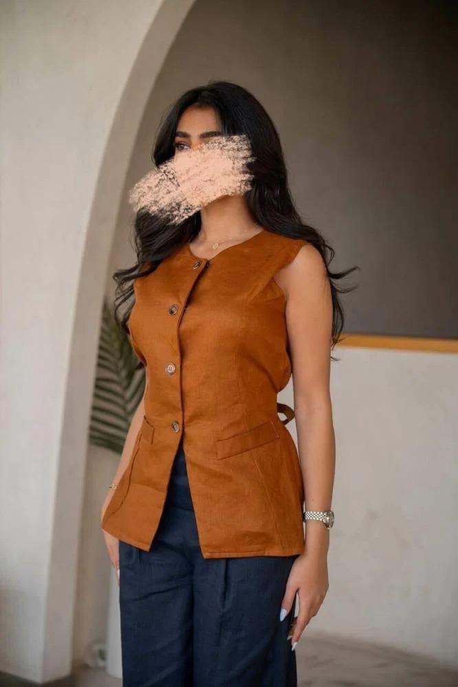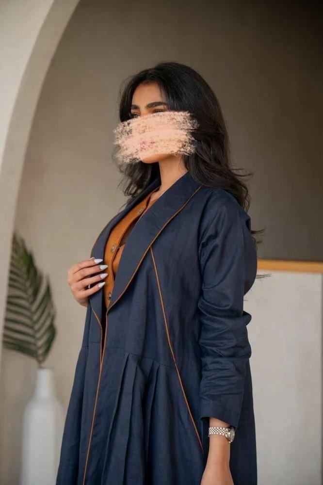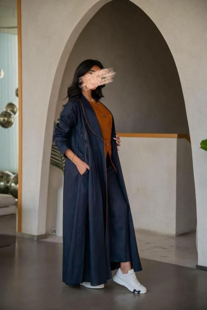تميزي بإطلالة أنيقة وعصرية مع هذه العباية المصممة من قماش الينن الطبيعي، بلون كحلي او اسود أنيق مع تفاصيل باللون النحاسي، تأتي مع طقم داخلي مكون من صديرية بلون نحاسي وبنطال واسع بلون كحلي، لتمنحك مظهراً متكاملاً وراحة طوال اليوم.